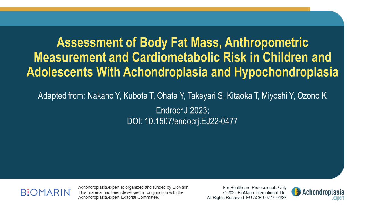 For some patients with achondroplasia, excess body weight is a major concern due to impaired linear growth, and data also suggest premature onset of cardiovascular or cerebrovascular events. Hypochondroplasia is an allelic disease of achondroplasia, but it is unclear whether these patients are susceptible to obesity. This cross-sectional study at a clinic in Japan investigated anthropometric measurements, body compositions, and cardiometabolic risk factors in 42 children with these conditions. Over the course of the study, none of the children developed metabolic syndrome or type 2 diabetes; however, although fasting plasma glucose, insulin, and measures of insulin resistance were within normal range, 17% of the children showed abnormalities in at least one of these measures. Although there was no significant association between anthropometric measurements or body fat mass and any cardiometabolic risk factors, standard deviation scores for body mass index and hip/height ratio were found to strongly correlate with percent body fat as assessed by dual energy X-ray absorptiometry.