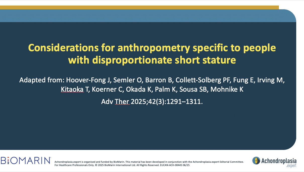 Hoover-Fong et al. present a guide for HCPs conducting anthropometric measurements in individuals with disproportionate short stature, with a primary focus on achondroplasia. The article responds to growing clinical and research needs for standardised and reproducible methods, particularly in the context of emerging growth-modifying therapies. It outlines key challenges and provides solutions for performing accurate measurements in children and adults with skeletal dysplasias.