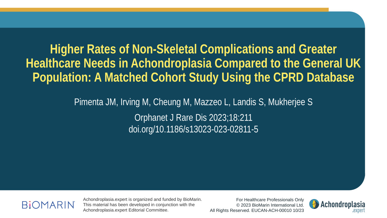 A total of 541 ACH cases and 2052 controls were identified for the CPRD cohort and of these 275 cases and 1064 matched controls had linkage to HES data. The results highlight that those with ACH have higher rates of a range of both skeletal and non-skeletal complications across their lifespan. Approximately twice as many non-skeletal complications were reported among individuals with ACH versus controls. To manage these complications, individuals with ACH have significantly increased healthcare needs compared with the general population.
