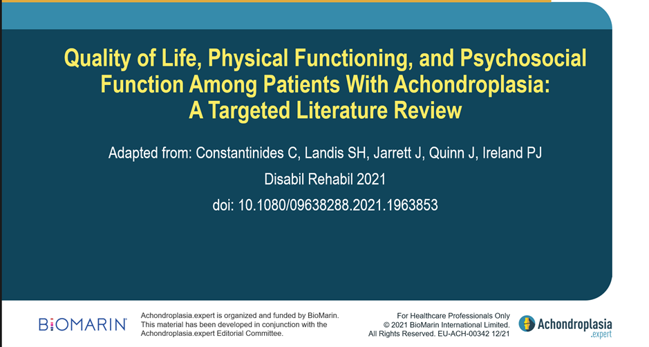 This study reviewed the literature on physical functioning, psychosocial function, and QoL in ACH compared to average stature or other short stature conditions. Data from 23 studies were included, and show that people with ACH face physical, social, and emotional challenges on a daily basis. However, despite the life-long complications, many patients are able to adapt functionally and psychologically. More research is needed to understand the impact of disproportionate short stature, as well as to assess the effects of limb lengthening and other treatments.