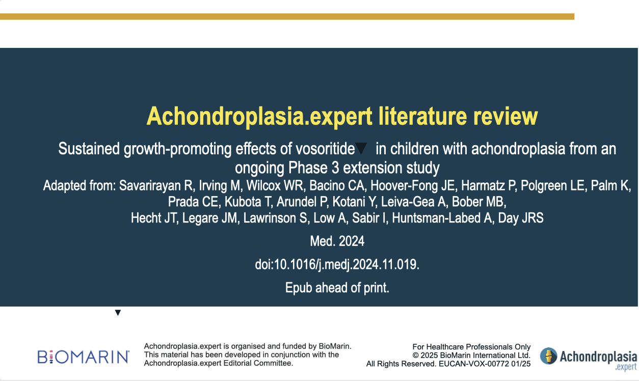 Savarirayan R, Irving M, Wilcox WR, Bacino CA, Hoover-Fong JE, Harmatz P, Polgreen LE, Palm K, Prada CE, Kubota T, Arundell P, Kotani Y, Leiva-Gea A, Bober MB, Hecht JT, Legare JM, Lawrinson S, Low A, Sabir I, Huntsman-Labed A, Day JRSGenet Med. 2024.
