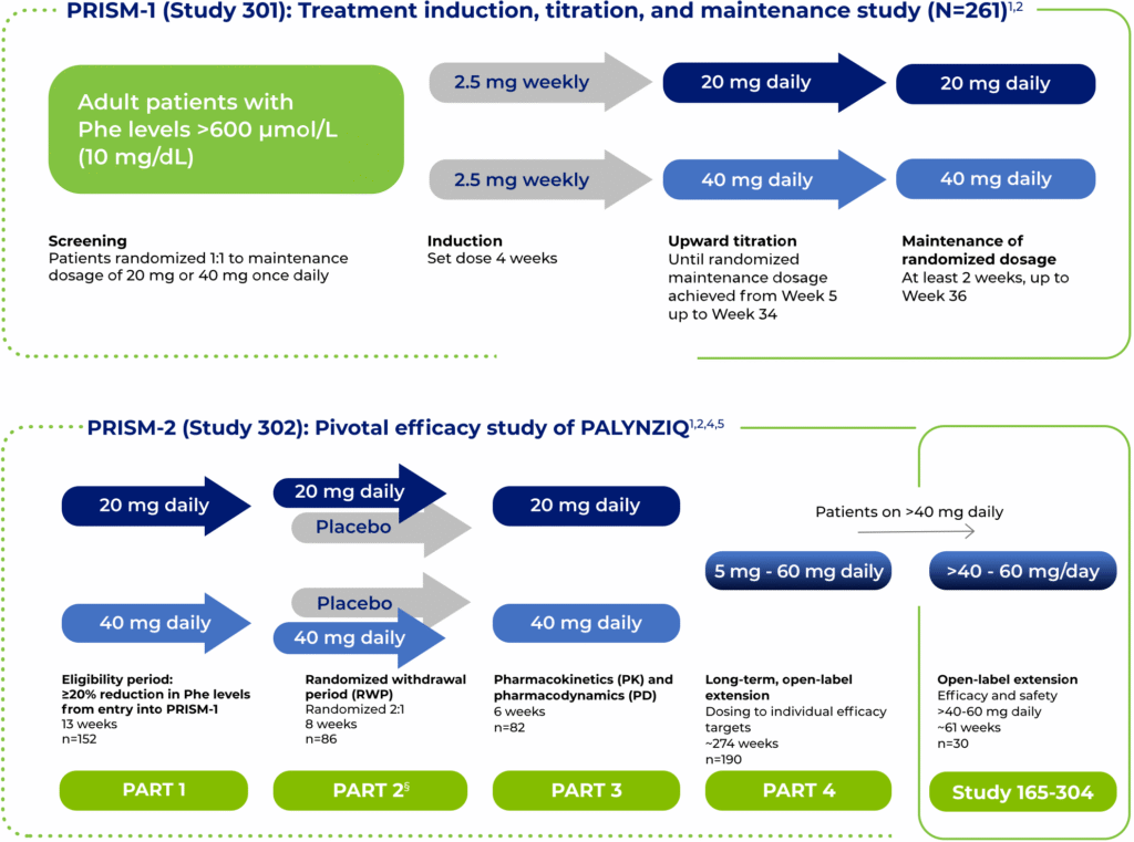 References: 1. PALYNZIQ [package insert]. Novato, CA: BioMarin Pharmaceutical Inc; 2025. 2. Thomas J, Levy H, Amato S, et al, for the PRISM investigators. Pegvaliase for the treatment of phenylketonuria: results of a long-term phase 3 clinical trial program (PRISM). Mol Genet Metab. 2018;124(1):27-38.doi:10.1016/j.ymgme.2018.03.006 3. Data on file. BioMarin Pharmaceutical Inc. 4. Qi Y, Patel G, Henshaw J, et al. Pharmacokinetic, pharmacodynamic, and immunogenic rationale for optimal dosing of pegvaliase, a PEGylated bacterial enzyme, in adult patients with phenylketonuria. Clin Transl Sci. 2021;14(5):1894-1905. doi:10.1111/cts.13043 5. Harding CO, Longo N, Northrup H, et al. Pegvaliase for the treatment of phenylketonuria: final results of a long-term phase 3 clinical trial program. Mol Genet Metab Rep. 2024;39:101084. doi:10.1016/j.ymgmr.2024.101084