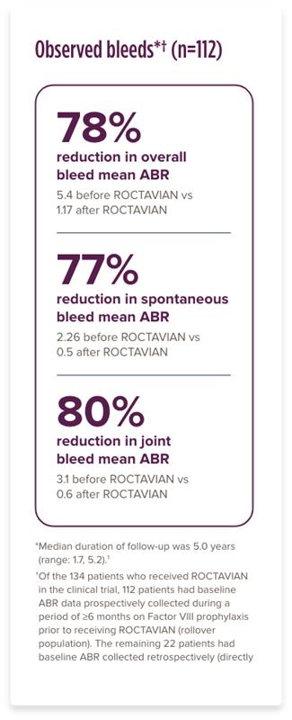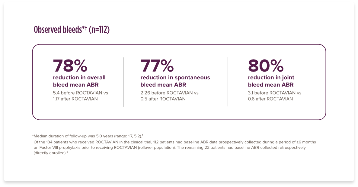 †Of the 134 patients who received ROCTAVIAN in the clinical trial, 112 patients had baseline ABR data prospectively collected during a period of ≥6 months on Factor VIII prophylaxis prior to receiving ROCTAVIAN (rollover population). The remaining 22 patients had baseline ABR collected retrospectively (directly enrolled).2