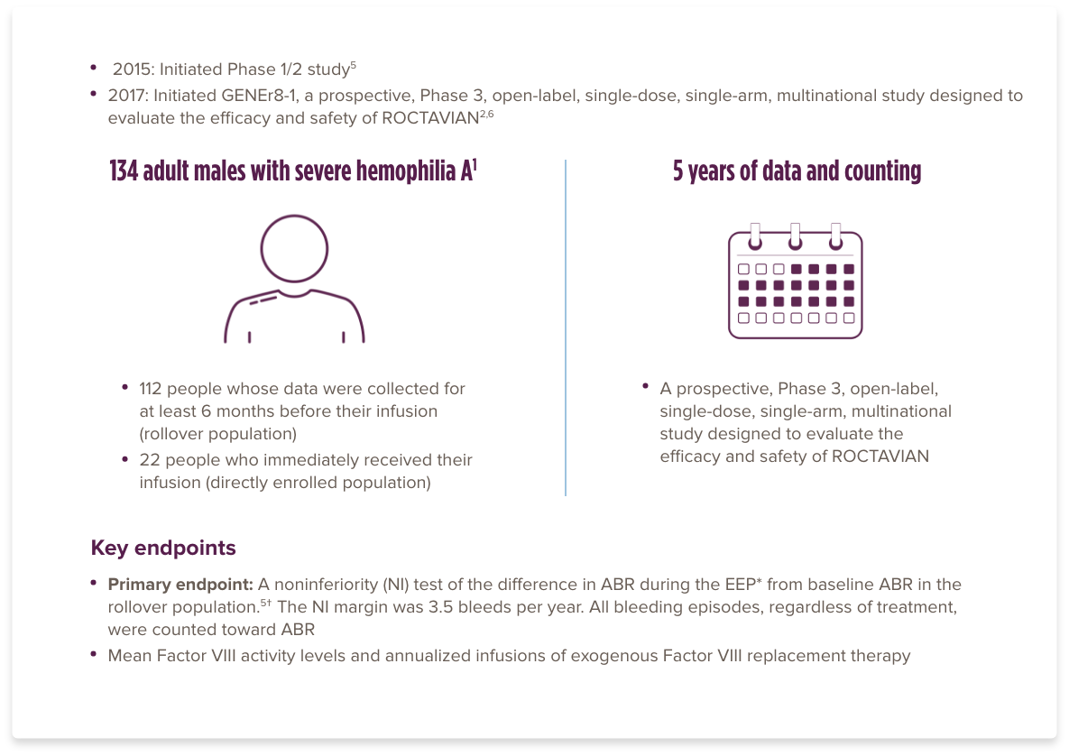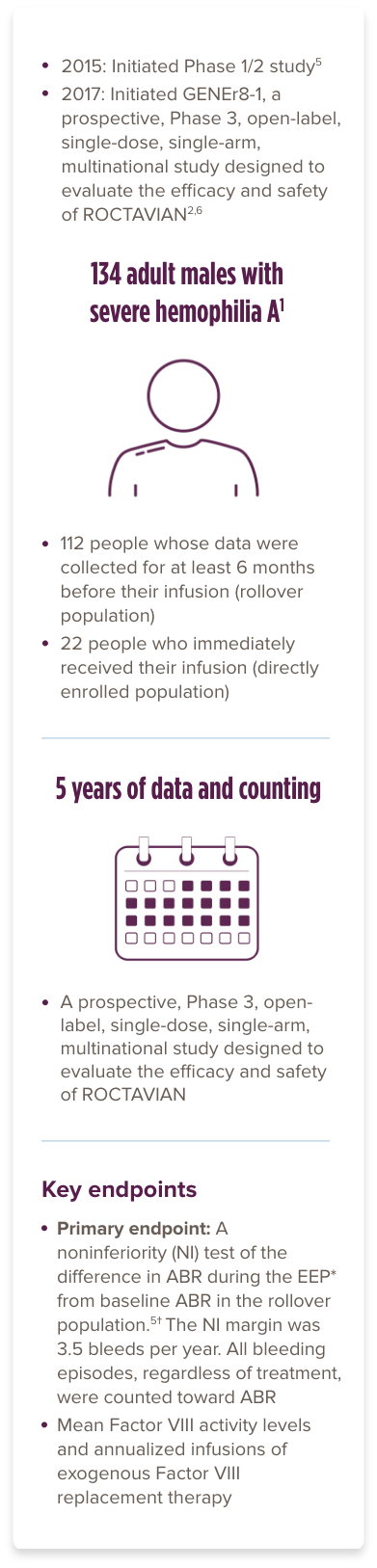 §Of the 134 patients who received ROCTAVIAN in the clinical trial, 112 patients had baseline ABR data prospectively collected during a period of ≥6 months on Factor VIII prophylaxis prior to receiving ROCTAVIAN (rollover population). The remaining 22 patients had baseline ABR collected retrospectively (directly enrolled).1