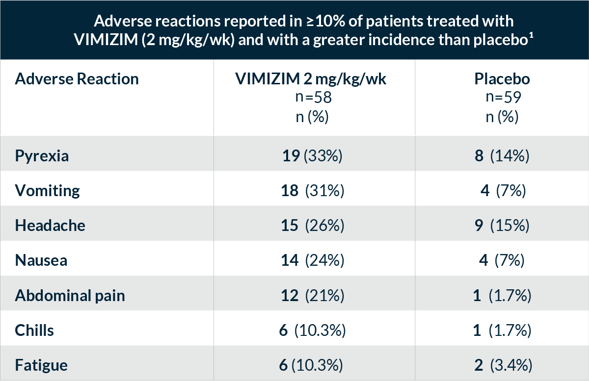 Hypersensitivity reactions, including anaphylaxis, were reported in patients treated with VIMIZIM in 6 clinical trials; consider the risks and benefits of readministering VIMIZIM following a severe reaction1