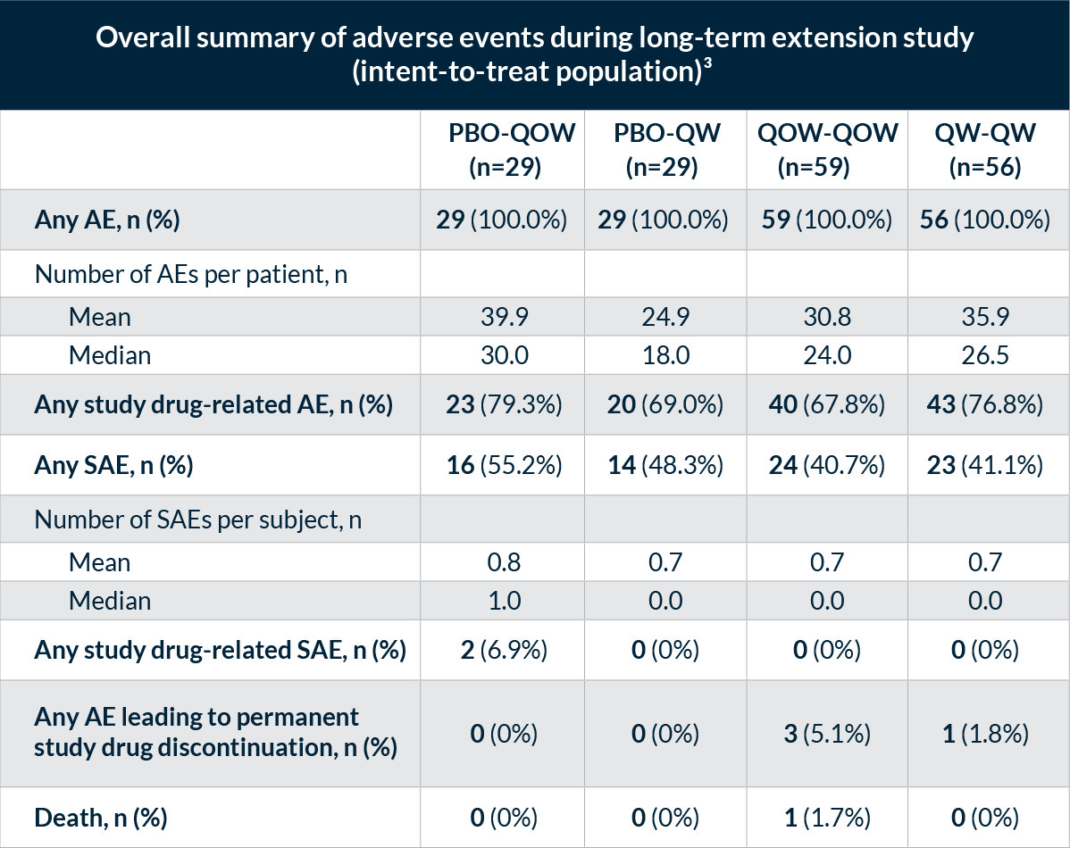 AE, adverse event; PBO, placebo; QOW, once every other week; QW, once a week; SAE, serious adverse event