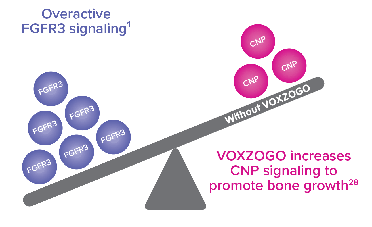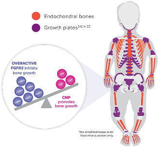 Overactive FGFR3 signaling relative to CNP signaling in growth plate cells is the underlying cause of inhibited bone growth in achondroplasia. Endogenous CNP levels cannot adequately regulate overactive FGFR3 signals.1