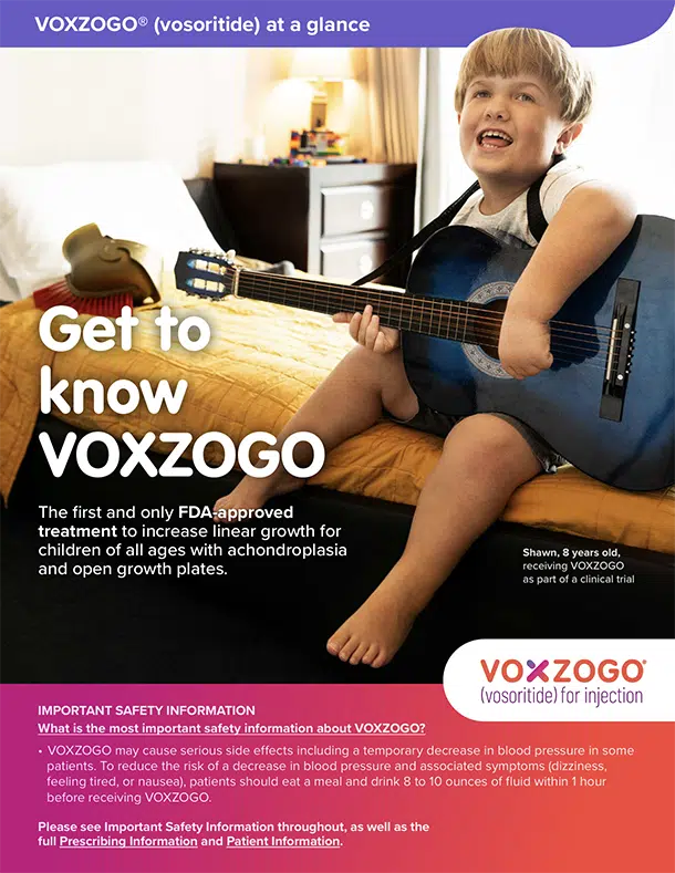 VOXZOGO® (vosoritide) is indicated to increase linear growth in pediatric patients with achondroplasia and open growth plates.