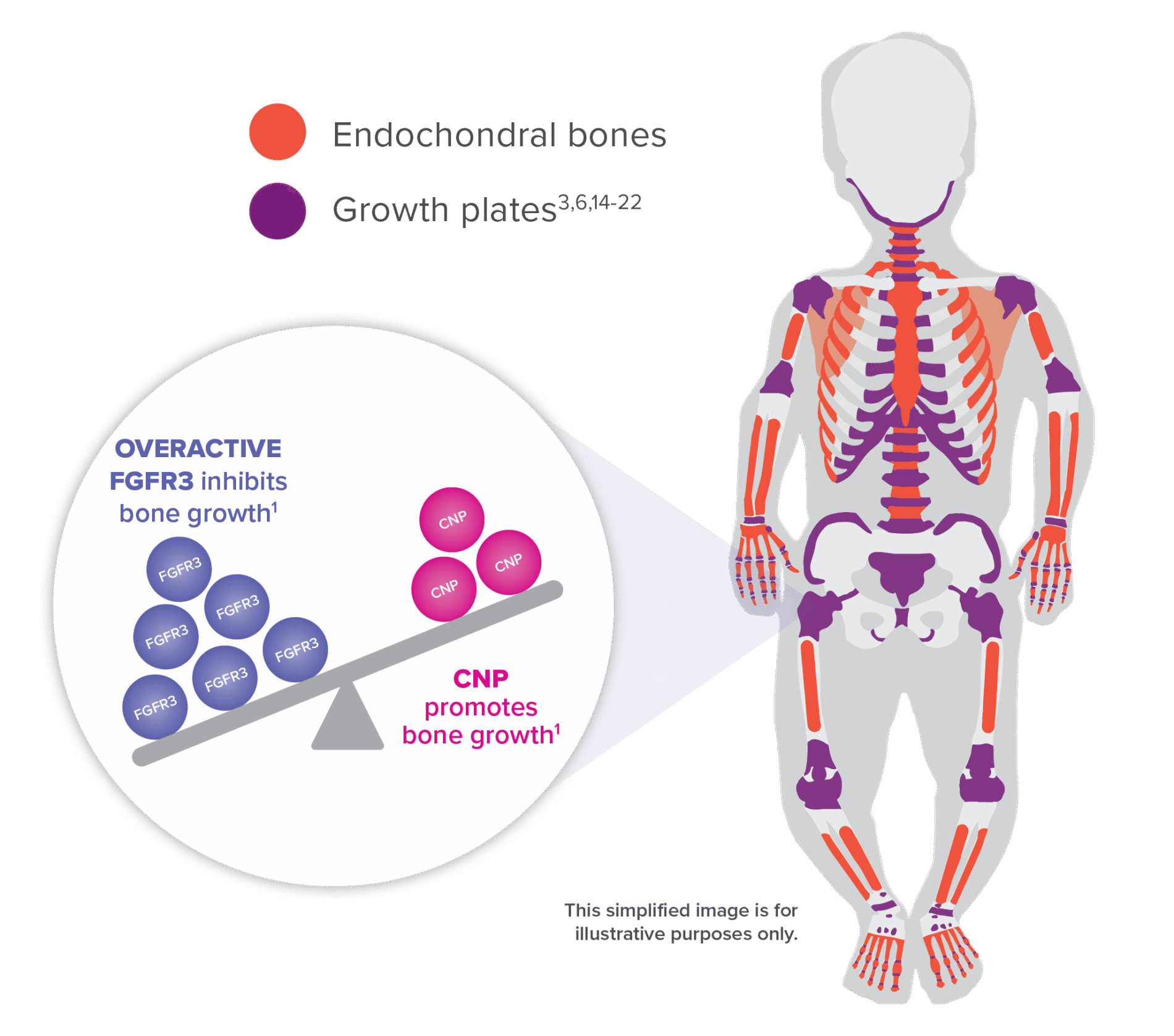 Overactive FGFR3 signaling relative to CNP signaling in growth plate cells is the underlying cause of inhibited bone growth in achondroplasia. Endogenous CNP levels cannot adequately regulate overactive FGFR3 signals.1