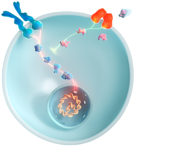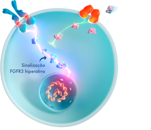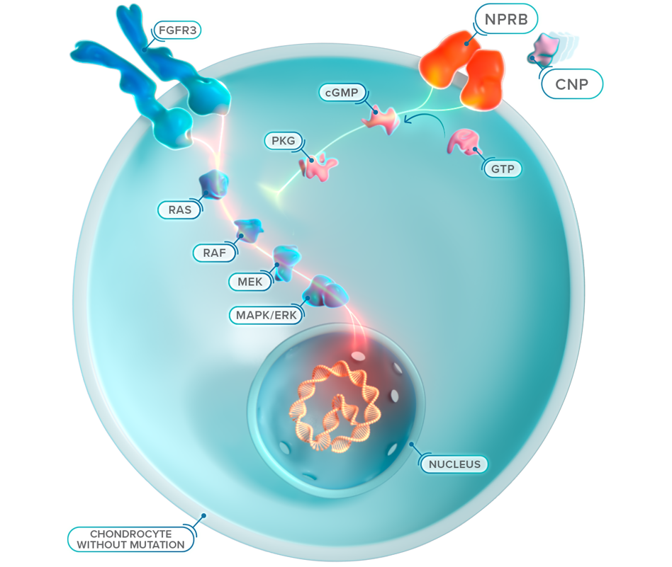A mutação com ganho de função faz com que o FGFR3 gere sinais excessivos para abrandar o crescimento ósseo, sobrepondo-se à sinalização contrária proveniente da via do NPRB/CNP, o que resulta num crescimento ósseo comprometido.4,16